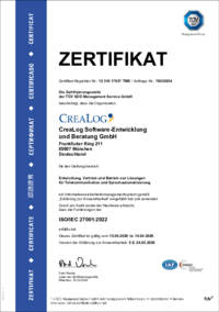 ZERTIFIKAT Zertifikat-Registrier-Nr.: 12 310 17937 TMS / Auftrags-Nr.: 70033934 Die Zertifizierungsstelle der TÜV SÜD Management Service GmbH bescheinigt, dass die Organisation CreaLog Software-Entwi