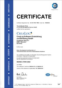 CERTIFICATE Certificate Registration No.: 12 310 17937 TMS / Order No.: 70033934 The Certification Body of TÜV SÜD Management Service GmbH certifies that the organization CreaLog Software-Entwicklung