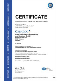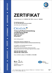 ZERTIFIKAT Zertifikat-Registrier-Nr.: 12 100/104 17937 TMS / Auftrags-Nr.: 70033934 Die Zertifizierungsstelle der TÜV SÜD Management Service GmbH bescheinigt, dass die Organisation CreaLog Software-E